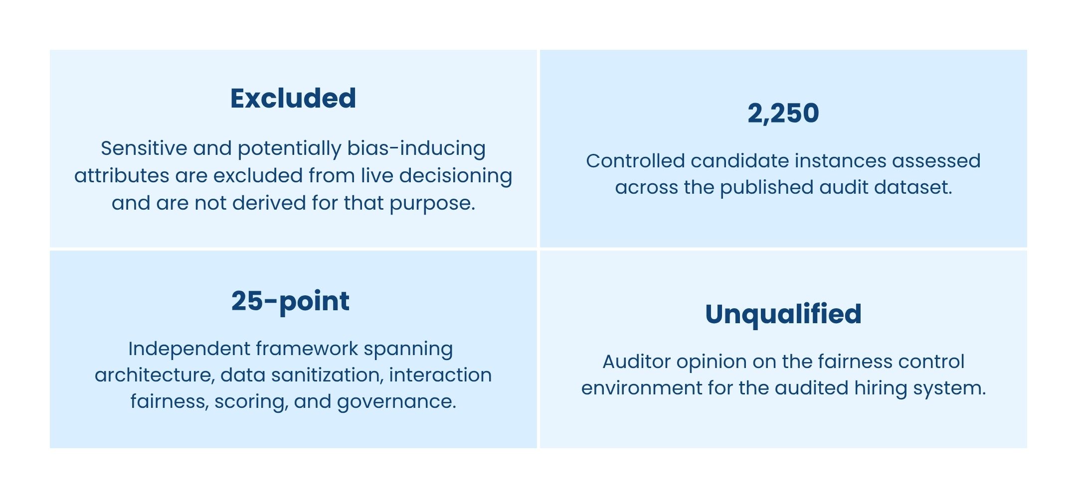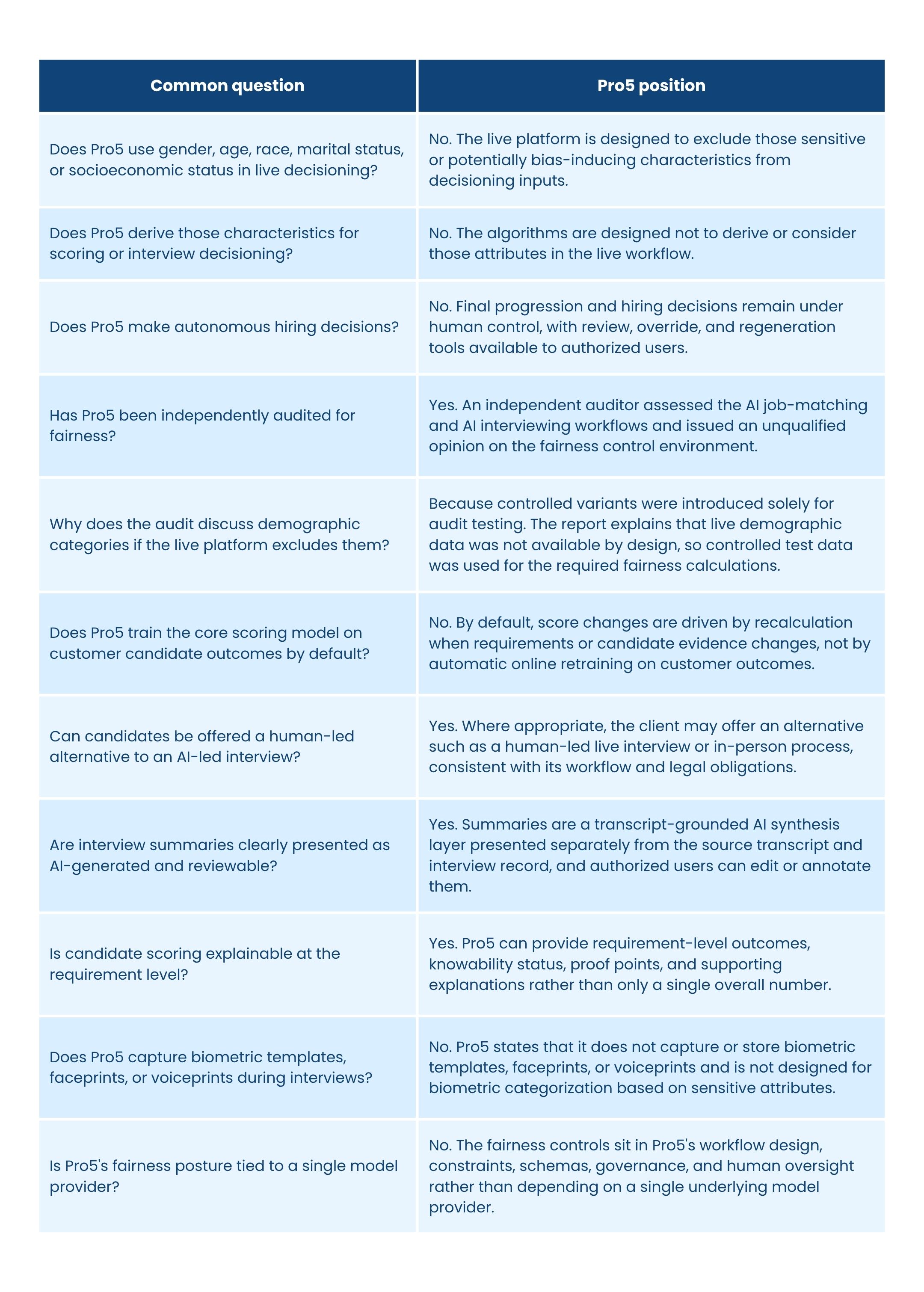 The audit provides strong evidence that the audited workflows were not exhibiting material differential treatment under controlled testing conditions. At the same time, the report itself notes that interview testing was performed on a smaller controlled sample and that controlled variants primarily test differential treatment while holding qualifications materially constant. For that reason, Pro5 treats the audit as an important validation layer - not as a reason to stop monitoring, governance, or human review.