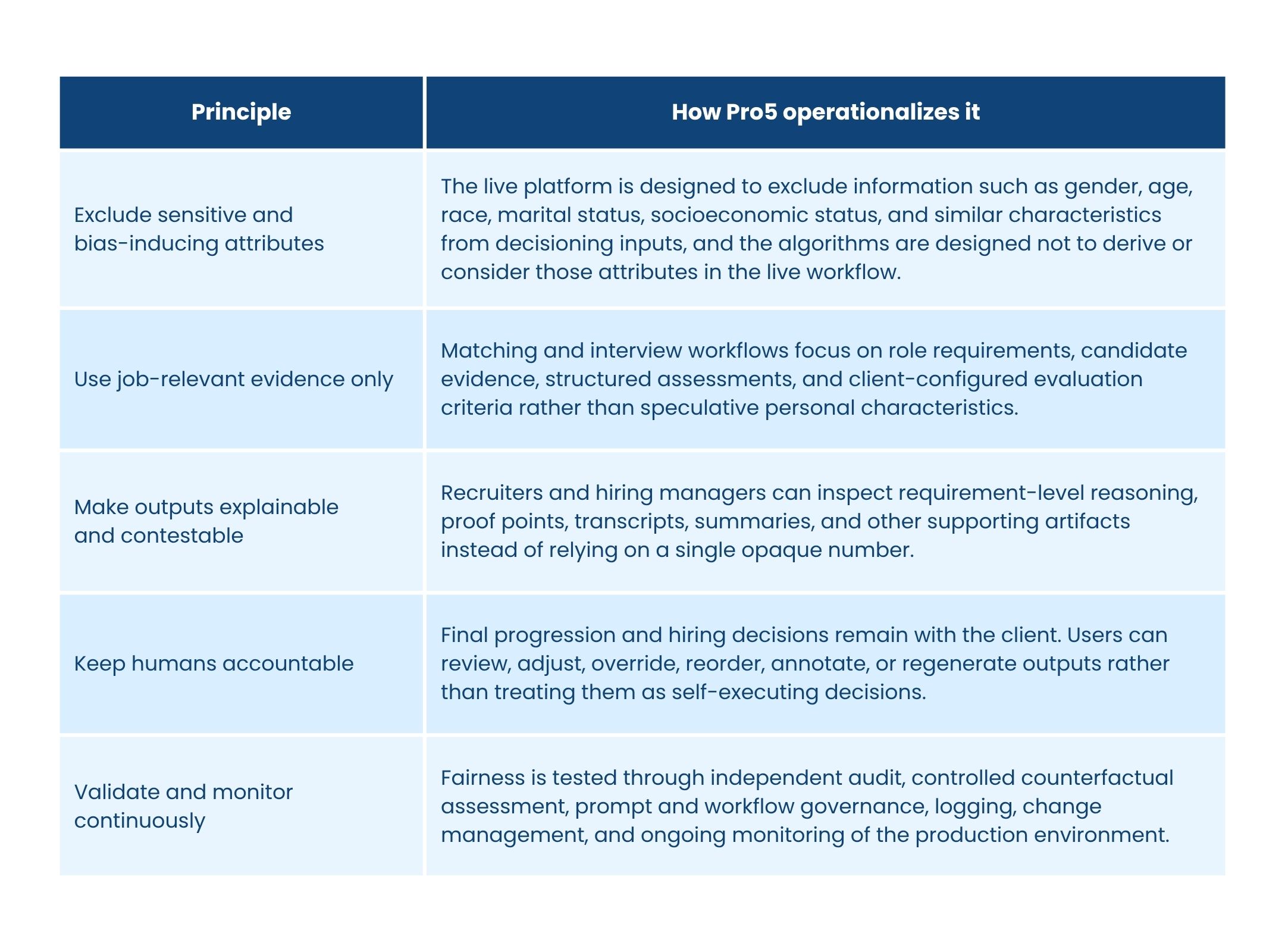 Our live platform is designed to exclude sensitive or potentially bias-inducing information such as gender, age, race, marital status, socioeconomic status, and similar characteristics from decisioning inputs. Our algorithms are explicitly designed not to derive or consider those attributes in the live workflow. Instead, Pro5 centers evaluation on job-relevant evidence, client-defined requirements, structured interview frameworks, and transparent proof points.