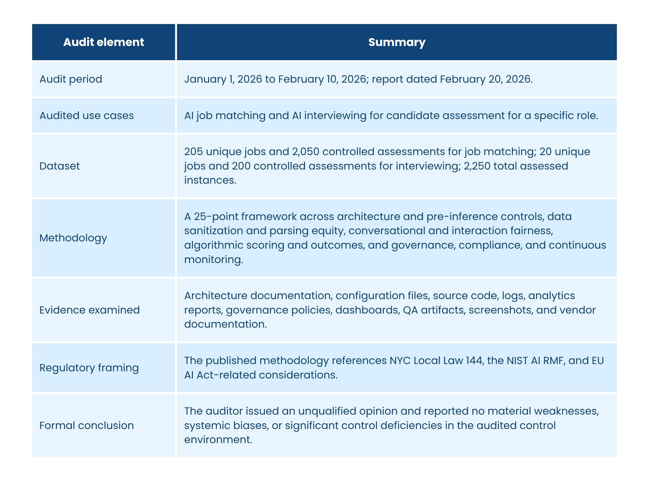 - The independent audit summarized here specifically covered AI job matching and AI interviewing.